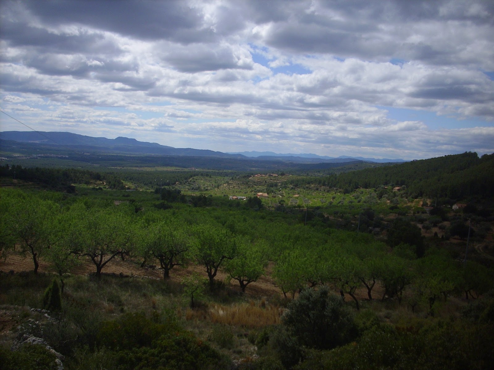Els bancals d'ametlers s'estenen per les faldes de la Serra i alternen amb els pinars i els matollars a partir d'ací.