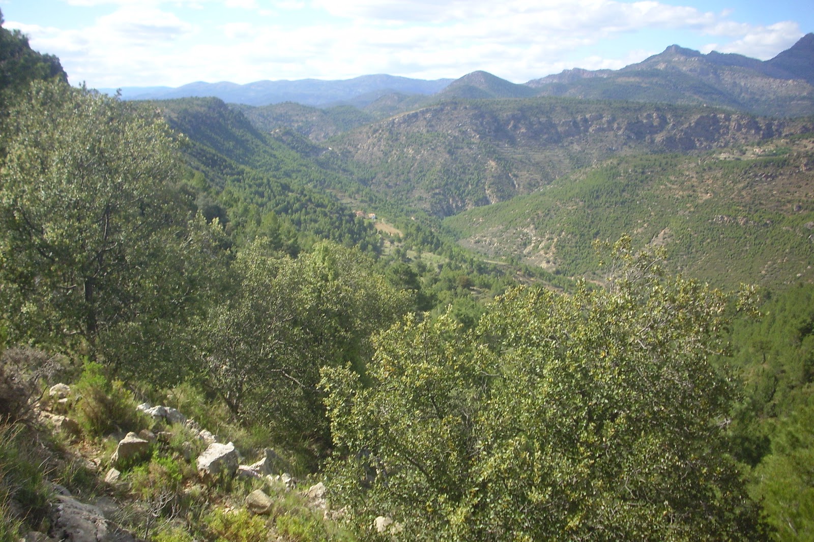 Seguim per dalt la lloma per un carril que segueix l'assegador travessant entre ginebres i savines. A la dreta deixem el camp de tir de Llucena. Quan el carril gira a la dreta clarament nosaltres continuem recte travessant el bosc de carrasques que es transforma en pinar de pi rojal conforme anem baixant. Ací el substrat calcari deixa pas als gresos grisencs i la vegetació marca el canvi de substrat.