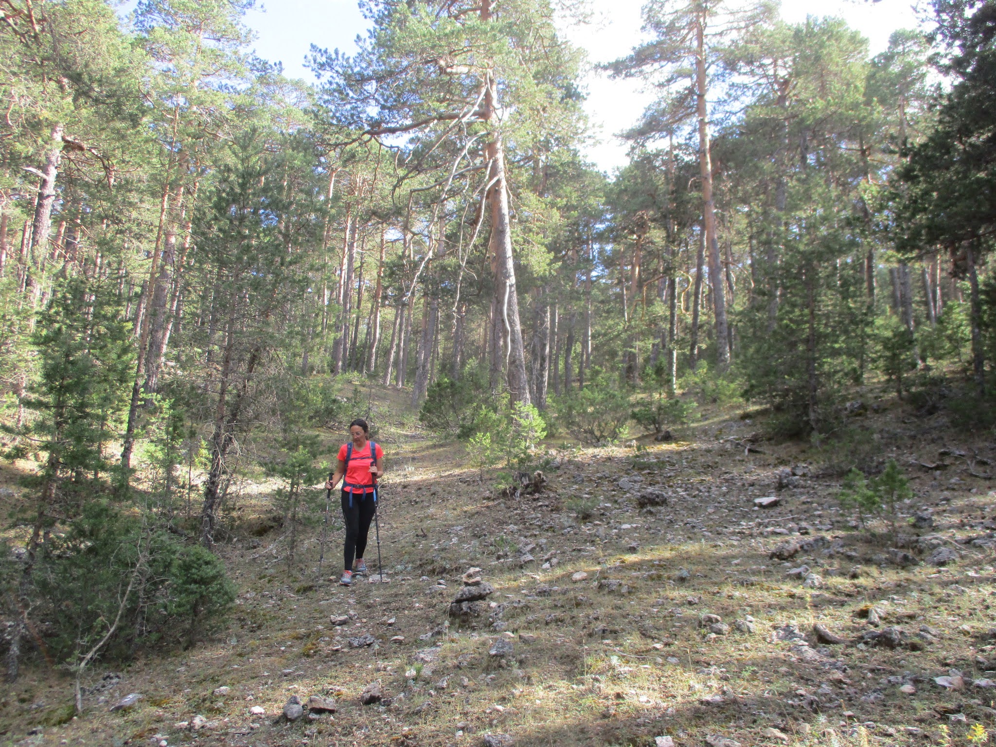 Tota la pujada l’hem feta envoltats d’un espès pinar de pi roig, acompanyat de xaparra (juniperus savina), ginebre (juniperus communis s. Alpina) i arlera (berberis hispanica), acompanyat per diverses herbàcies. Este serà el paisatge vegetal que ens acompanyarà quasi tota la ruta, encara que l’acompanyament florístic del pinar anirà variant amb zones amb més ginebres, xaparres o arleres, i d’altres on el pi és el majoritari, depenent de l’orientació, la densitat del pinar i de l’explotació que s’hi ha fet o s’hi fa.